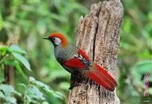 赤尾噪鹛中型鸟类,体长24~28厘米。头顶至后颈红棕色,两翅和尾鲜红色,眼先、眉纹、颊、颏和喉黑色,眼后有一灰色块斑。其余上下体羽大都暗灰或橄榄灰色。特征极明显,特别是通过鲜红色的头顶、翅和尾。…全部>>