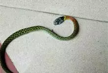 红脖颈槽蛇:游蛇科、颈槽蛇属的爬行动物。体型中等大小,全长约77-95厘米。头背草绿色,上唇鳞色稍浅,部分鳞沟黑色;头腹面污白色。躯干及尾背面草绿色,颈区及体前段鳞片间皮肤腥红色;躯干及尾腹面黄白色。…全部>>
