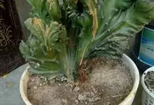 麒麟掌,是大戟科大戟属多年生植物。为金刚纂的带化变异变种。麒麟掌的株乳汁丰富;它的茎圆柱状,上部多分枝,绿色;叶互生,稀少,常生于嫩枝顶端脊上,倒卵形、倒卵状长圆形或匙形,顶端钝圆,具小凸尖,全缘,…全部>>