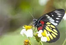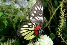 报喜斑粉蝶是粉蝶科斑粉蝶属的一种动物,又名红肩粉蝶、藤粉蝶等。幼虫群集性很强,从同一卵块孵化出的幼虫,幼龄期全部群集在一起取食,高龄幼虫常分散成小群。幼虫群集危害叶片,造成秃枝,严重者可将树吃成光杆,…全部>>