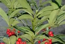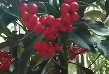 朱砂根是报春花科紫金牛属植物,又名铁凉伞、红铜盘、百两金、大罗伞、开喉箭等,为常绿小灌木,高1~2米,茎粗壮,无毛,除侧生特殊花枝外,无分枝,叶片革质或坚纸质,椭圆形、椭圆状披针形至倒披针形,…全部>>