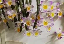 玫瑰石斛是兰科石斛属的多年生附生草本植物。茎斜下或下垂,青绿色,圆柱形,节间鞘具绿或白色相间的条纹;叶窄披针形;花序短,生于已落叶的老茎上部,花序梗长,萼片和花瓣白色,上部带淡紫色,干后蜡质状,…全部>>