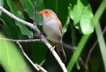 橙颊梅花雀体长约10厘米,头部灰色,两侧有大块橙色区域,嘴基及眼下方有黑纹,两条黑纹间呈白色,颊部有橙红色块斑,喙为红色至橙红色,背部及翼为褐色,腰为鲜红色,身体腹面淡灰色,腹部白色至皮黄色,…全部>>
