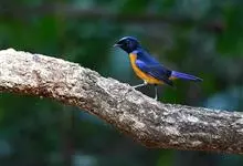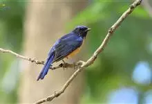 棕腹大仙鹟:体重24-28克,体长15-17厘米,是一种小型的色彩亮丽的鹟。雄鸟上体深蓝,下体棕色,脸黑,额、颈侧小块斑、翼角及腰部亮丽闪辉蓝色。与棕腹仙鹟易混淆,区别在色彩较暗。雌鸟灰褐,…全部>>