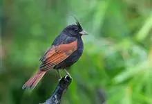 凤头鹀:属小型鸣禽,体重21-31克,体长134-175毫米。以头顶的细长羽冠为特征,雄鸟全身几乎均为黑色具蓝色光泽,两翅和尾以及尾上覆羽栗红色。雌鸟具短的褐色羽冠,上体暗橄榄褐色,…全部>>