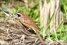 山麻雀:小型鸟类,体长13-15厘米。雄鸟上体栗红色,背中央具黑色纵纹,头棕色或淡灰白色,颏、喉黑色,其余下体灰白色或灰白色沾黄。雌鸟上体褐色具宽阔的皮黄白色眉纹,颏、喉无黑色。…全部>>
