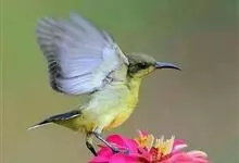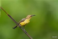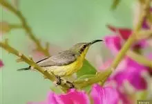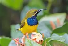 黄腹花蜜鸟是雀形目太阳鸟科花蜜鸟属鸟类。体型较小、喙略短而弯、腹部黄色。雄鸟繁殖季节颏及胸黑紫色并泛金属光泽,具有绯红色及灰色胸带,将上腹部黑色斑与前胸隔开,肩斑为橙黄色丝质羽,上体橄榄绿色,…全部>>