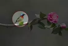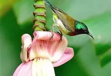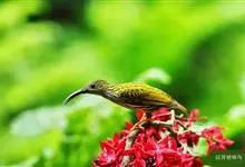 叉尾太阳鸟,雀形目太阳鸟科太阳鸟属留鸟;为小型鸟类,雄鸟头顶辉蓝绿色,上体橄榄绿色,腰明黄色,中央尾羽亮翠蓝色,羽轴针状延长,外侧尾羽黑色具白色端斑,头侧黑色,颜、喉和胸为绛红色,…全部>>