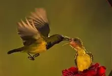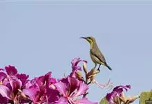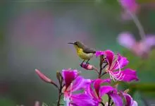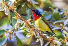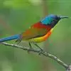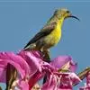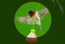 绿喉太阳鸟:共有9个亚种。小型鸟类,雄鸟体长13-15厘米、雌鸟10-12厘米。雄鸟前额至后颈、颏和喉辉绿色,头侧黑色,颈侧和背暗红色,两肩、下背橄榄绿色,腰鲜黄色,尾上覆羽和中央尾羽暗绿色,…全部>>