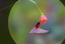 叉尾太阳鸟,雀形目太阳鸟科太阳鸟属留鸟;为小型鸟类,雄鸟头顶辉蓝绿色,上体橄榄绿色,腰明黄色,中央尾羽亮翠蓝色,羽轴针状延长,外侧尾羽黑色具白色端斑,头侧黑色,颜、喉和胸为绛红色,…全部>>