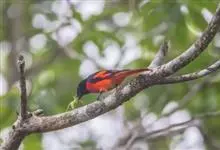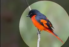 灰喉山椒鸟:共有8个亚种。体长18-22厘米。雄鸟头部和背亮黑色,腰、尾上覆羽和下体朱红色,翅黑色具一大一小的两道朱红色翼斑。中央尾羽黑色,外侧尾羽基部黑色,端部红色。…全部>>