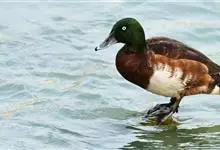 青头潜鸭,是雁形目鸭科潜鸭属的迁徙性鸟类。雄性头部和颈部为黑色,有绿色光泽,上体为黑褐色,尾下和翼下覆羽为白色。雌性头部和颈部为黑褐色,腹部以白色羽毛为主,两翅、腰和尾上尾下覆羽与雄性基本相同。…全部>>