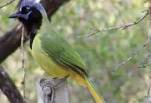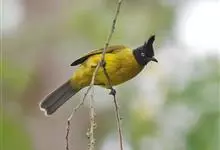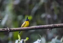 黑冠黄鹎:体长18-21厘米,是一种中等体型偏黄色鹎。整个头、颈、颏、喉黑色,头顶有显著直立的羽冠,黑色,上体褐橄榄黄绿色,下体橄榄黄色。虹膜偏红;嘴及脚黑色。…全部>>