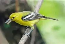 黑翅雀鹎:体重14-19克,体长11.5-16厘米。是树栖性绿色小鸟,外形与叶鹎相似,下体黄色。鸟喙直,翼长而尖,总体羽毛是绿色和黄色相结合,翼上具两道明显近白色横纹,翼近黑而羽缘白。…全部>>