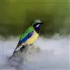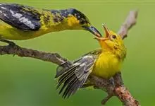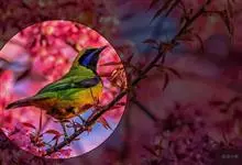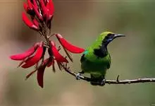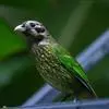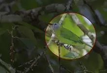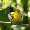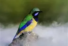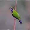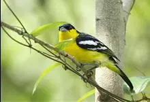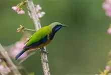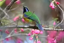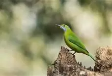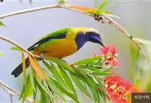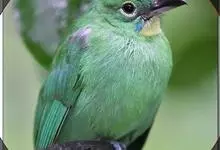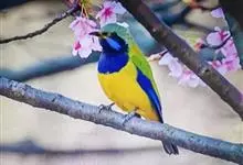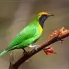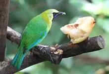 蓝翅叶鹎:小型鸟类,体长15-18厘米。雄鸟通体草绿色,尾蓝绿色,肩和翅亮蓝 色,胸缀有黄色,颏、喉黑色。雌鸟颏,喉蓝绿色。栖息在海拔1500米以下的常绿阔叶林、次生林和林缘疏林灌丛中。…全部>>