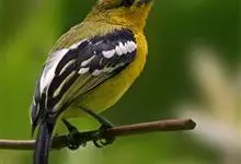 橙腹叶鹎体形大小和金额叶鹎相似,体长16~20厘米。额至后颈黄绿色,其余上体绿色,小覆羽亮钴蓝色,形成明显的肩斑。颏、喉、上胸黑色具钴蓝色髭纹,其余下体橙色。飞羽和尾羽雄鸟黑色、雌鸟绿色。…全部>>