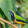 金额叶鹎是和平鸟科、叶鹎属的鸟类。体长16-20厘米。额和头顶前部金桔色,整个上体包括两翅表面草绿色。颏、喉黑色,其外围有一圈黄色,其余下体浅绿色,翼缘蓝紫色,翅上小覆羽翠蓝色。野外特征极明显,…全部>>