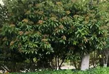 石楠 Kalkman),是蔷薇科石楠属的常绿乔木,高5~12米,株型紧凑,树冠圆球形。树枝为褐灰色;鳞片为褐色,没有毛;叶片革质,长椭圆至侧卵状椭圆形,有锯齿,新叶红色光亮。复伞房花序,白色小花,…全部>>