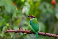 黑眉拟啄木鸟,为须䴕科、拟啄木鸟属的小型鸟类,体长20-25厘米,外形和金喉拟啄木鸟非常相似,但具粗著的黑色眉纹,头侧和耳覆羽以及下喉蓝色而不为银灰色,前颈两侧各有一块鲜红色斑。全部>>