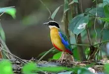蓝翅八色鸫是雀形目八色鸫科的鸟类。体长17-20厘米,体重类约48-70克,体型圆胖,尾短,腿长,以身体具有红、绿、蓝、白、黑、黄、褐、栗等鲜艳夺目,丰富艳丽的色彩而得名,是很有观赏价值的鸟类。主要…全部>>