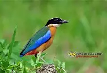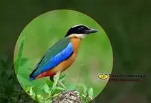 绿胸八色鸫:是雀形目八色鸫科的鸟类,共有12个亚种。体长为16-18厘米,体重65-69克。体型圆胖,尾短,腿长。头黑,上体绿色,两翼深色而具白色斑纹,头顶至后枕深褐,胸及腹部苹果绿,臀亮红。…全部>>