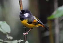 金胸雀鹛是莺科、雀鹛属小型鸟类,体长10-11厘米。头黑色,头顶中央有一道白色中央冠纹,颊和耳羽亦为白色,在黑色的头部极为醒目。上体深灰沾绿。两翅黑色,外侧飞羽有黄色外缘和白色端斑;尾凸状、黑色。…全部>>