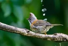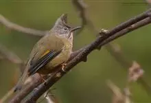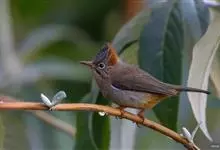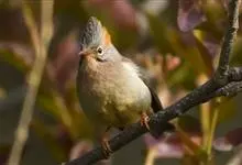纹喉凤鹛:小型鸟类,体长13-16厘米。头顶和羽冠暗褐色或褐灰色,上体橄榄褐色,飞羽黑褐色,外侧次级飞羽表面橙黄色,构成一块纵形翼斑,极为醒目。颏、喉淡棕白色,具黑色纵纹,腹和尾下覆羽橙黄色。…全部>>
