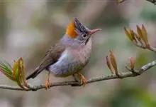 栗耳凤鹛,雌雄羽色相似。额、头顶至枕灰色,头顶有一短的不甚明显的羽冠,系由头顶羽毛向后延长形成、灰色具细的白色羽干纹,眼先灰色,眉纹白色不甚明显,其上有时杂有褐斑,…全部>>