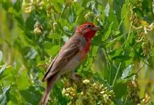 普通朱雀是雀形目雀科朱雀属鸟类,又名红朱雀、马料、青麻料。雄鸟上体红色,下体淡红色;头部、喉部、胸部及腰部亮红色;背部褐色染红色;两翼及尾黑褐色,羽缘染红色。雌鸟上体橄榄褐色,下体近白色,…全部>>