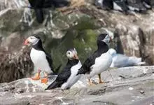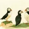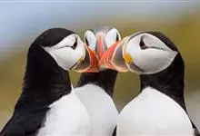 角海鹦:是鸻形目海雀科的鸟类,体重581-648克,体长约32厘米,翼展18-20厘米。是一种身体结实的鸟类,蹼脚、翅膀短,擅长游泳捕鱼,而在陆地上行走时则显得僵硬、步履蹒跚。有一张大嘴巴,呈三角形…全部>>