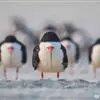 白腹海鹦,前趾间有蹼膜,后趾缺如。翅窄而短小,尾短。体羽黑白二色,雌雄羽色相似全部>>