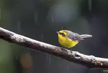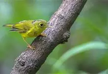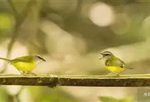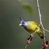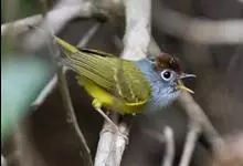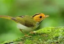 黑脸鹟莺:体长10厘米,是有特色的体小而多彩的莺鸟。粗眉纹,颏、喉及尾下覆羽黄色,脸罩黑,头顶及颈背灰色,上体绿,无翼纹,腹白。虹膜褐色;上嘴色深,下嘴肉色;脚偏绿色。…全部>>