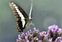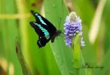 青带凤蝶Graphium sarpedon ,又名青凤蝶,是最普遍的中型凤蝶,飞行速度很快。青带凤蝶的翅膀中央有许多浅蓝色的斑点,很整齐地排列成一条直线。这些斑点由上而下逐渐变大,就像一条青色的带子。全部>>