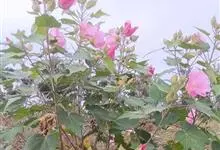 木芙蓉,锦葵科木槿属落叶灌木或小乔木。小枝上有细绒毛;叶片为卵状心形,托叶为披针形,常早落;花单生,花萼为钟形,花冠初为白色或淡红色,后逐渐变为深红色;果实为扁球形,有淡黄色的毛附着。花期8到10月。…全部>>