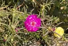 大花马齿苋:一年生草本,高10-30厘米。茎平卧或斜升,紫红色,多分枝,节上丛生毛。叶密集枝端,较下的叶不规则互生,叶片细圆柱形,无毛。花单生或数朵簇生枝端,直径2.5-4厘米,…全部>>