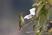 长嘴捕蛛鸟,小型鸟类,体长14-16厘米。嘴长而尖向下弯曲。上体橄榄绿色,眼先和短眉灰白色,两翅和尾暗褐色,外翈羽缘橄榄绿色,羽端灰褐色,自嘴基沿喉侧有一黑色纵纹。颏、喉灰白色,其余下体鲜黄色,…全部>>
