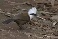褐头凤鹛小型鸟类,体长12~13厘米。头顶有可竖立的红褐色羽冠,头侧、枕、颊、喉和下体白色,羽冠两侧黑色,头的两侧各有一条黑线,其下端与黑色颧纹末端相接,上端与从眼后伸出的一条黑线相连,…全部>>