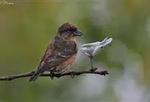 红交嘴雀:体重28-48克,体长145-175毫米。是燕雀科交嘴雀属的鸣禽。是一种小型的燕雀。雄鸟通体砖红色,上体较暗,腰鲜红色;翼和尾近黑色,头侧暗褐色;雌鸟暗橄榄绿或染灰色,…全部>>