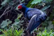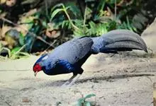 蓝鹇是雉科、鹇属一种大型雉类。体长50-80厘米。雄鸟头颈黑色,羽冠白色,有时杂以黑斑;脸红色,额部肉冠和脸部肉垂亦为红色;后颈和颈侧蓝黑色;肩赤红色;翅上覆羽及外侧次级飞羽黑色,…全部>>