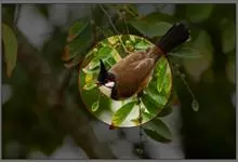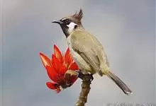 白颊鹎是雀形目鹎科鸟类。体长19—21厘米。雌雄相似。成鸟头部深灰色具一显著的羽冠,白色脸侧具一黑色点状斑纹。颏部、喉部黑色;胸部、腹部、两胁近白色;背部、两翼近灰色;尾下覆羽黄色,尾羽灰色,…全部>>