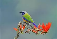 橙腹叶鹎体形大小和金额叶鹎相似,体长16~20厘米。额至后颈黄绿色,其余上体绿色,小覆羽亮钴蓝色,形成明显的肩斑。颏、喉、上胸黑色具钴蓝色髭纹,其余下体橙色。飞羽和尾羽雄鸟黑色、雌鸟绿色。…全部>>
