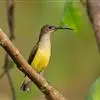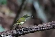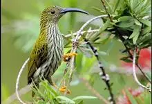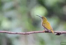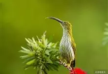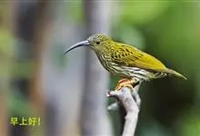 纹背捕蛛鸟:为太阳鸟科捕蛛鸟属的鸟类。是太阳鸟科中体型较大的一种,体重25-45克,体长160-210毫米。嘴粗长而尖且向下弯曲。上体橄榄黄色具黑色中央斑纹。下体淡黄白色满布黑色纵纹,尾具黑色次端斑。…全部>>