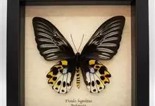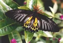 金裳凤蝶是凤蝶科、裳凤蝶属的动物。金裳凤蝶身体呈黑色,头、颈和胸侧有红毛,腹部有黑黄两色相间条纹,雄蝶前翅黑色,具黑天鹅绒光泽,各脉两侧灰白色,后翅金黄色,各室外缘有等腰三角形黑斑1枚,斑内侧有晕,…全部>>