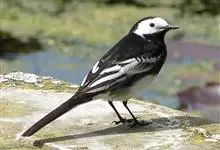 日本鹡鸰:体长约20厘米。上体多黑色,额、颏及眉纹白,下体白,两翼黑而具白色横斑及羽缘,尾黑而边缘白色。虹膜深褐色;嘴黑色;脚黑色。飞行时发出嘁喳声,具复杂而独特的鸣声。喜农田、稻田和溪流。…全部>>