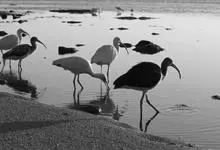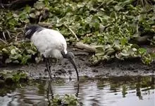 圣鹮头、颈黑色,身体白色,初级和次级飞羽尖端黑色。喙长且厚、黑色下弯,跗蹠与趾黑色。下背部有大量黑色纱状装饰羽,翼下裸露皮肤红色,体侧有时带黄褐色。亚成鸟的头、颈有羽毛,斑驳黑色带有白色纵纹,…全部>>