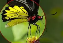 金裳凤蝶是凤蝶科、裳凤蝶属的动物。金裳凤蝶身体呈黑色,头、颈和胸侧有红毛,腹部有黑黄两色相间条纹,雄蝶前翅黑色,具黑天鹅绒光泽,各脉两侧灰白色,后翅金黄色,各室外缘有等腰三角形黑斑1枚,斑内侧有晕,…全部>>