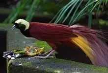 大极乐鸟是极乐鸟属中最大的鸟种。成年雄鸟体长可达到43厘米,雌性可达35厘米。雄鸟的额、颊、喉等墨绿色;头、颈黄色;上体暗赤栗色;腹部葡萄红色,胁部有长饰羽,其基部橙黄,中部黄色,…全部>>