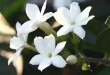 素馨花,木犀科素馨属多年生的攀援灌木植物。攀援灌木,小枝圆柱形,具棱或沟;叶对生,叶轴常具窄翼,小叶片卵形或长卵形;聚伞花序顶生或腋生,花序梗长,苞片线形,花萼无毛,裂片锥状线形,花冠白色,…全部>>