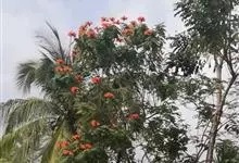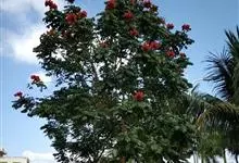 火焰树是紫葳科、火焰树属乔木,树皮平滑,灰褐色。奇数羽状复叶,对生,连叶柄长达45厘米;小叶13-17枚,叶片椭圆形至倒卵形,伞房状总状花序,顶生,密集;被褐色微柔毛,具有明显的皮孔;花冠一侧膨大,…全部>>
