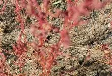 盐地碱蓬 Pall.)是苋科碱蓬属植物。一年生草本,高20-80厘米,绿色或紫红色。茎直立,圆柱状,黄褐色,有微条棱,无毛;分枝多集中于茎的上部,细瘦,开散或斜升。叶条形,半圆柱状。…全部>>
